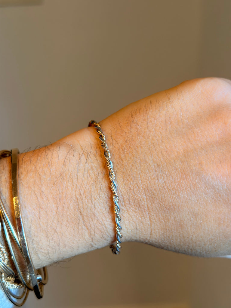 To measure your bangle size, tuck your thumb and fingers into a point as if you were going to slide a bangle over your hand. Take a tape measure or piece of string and wrap it fully around your knuckles or the widest part of your hand. I recommend sizing up to the closest size if you are in-between sizes.