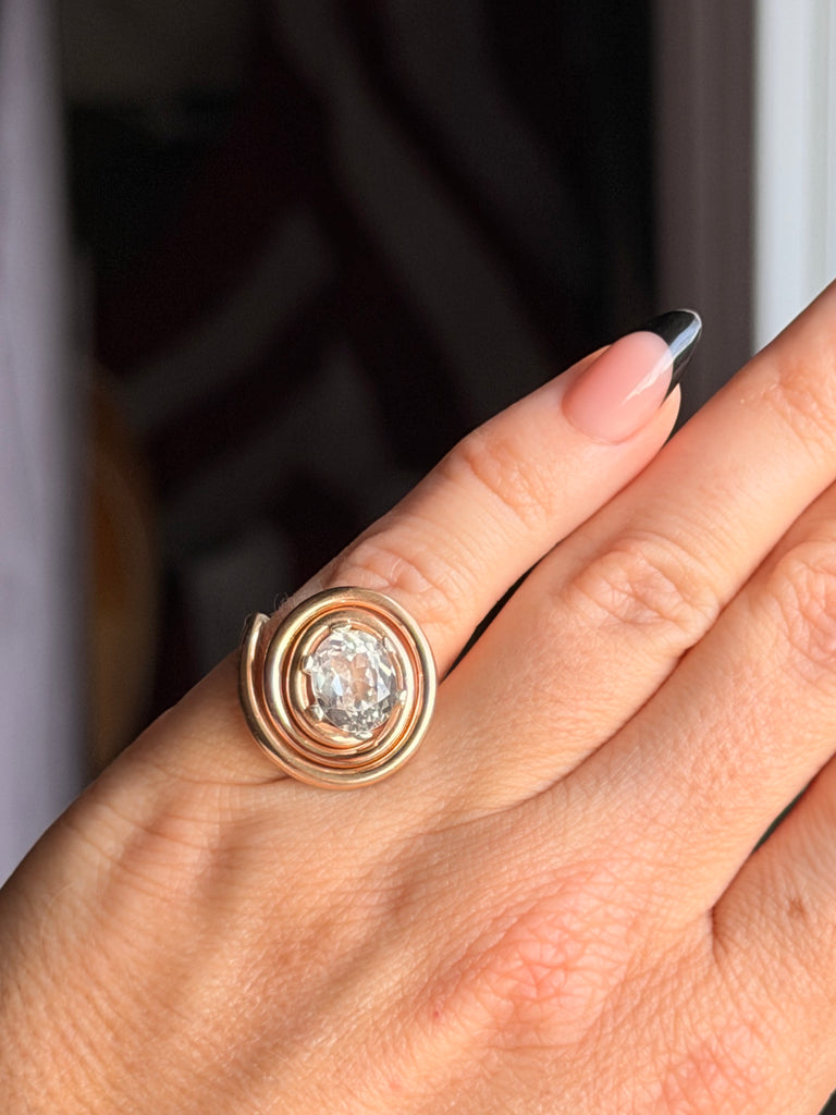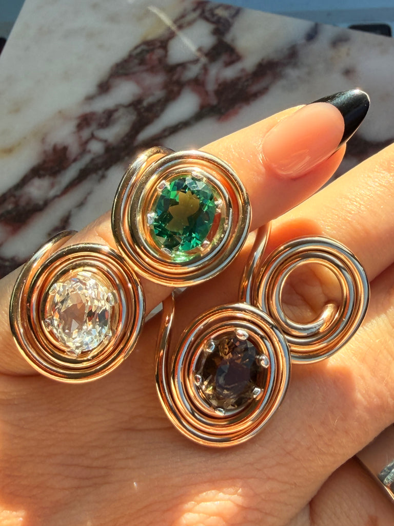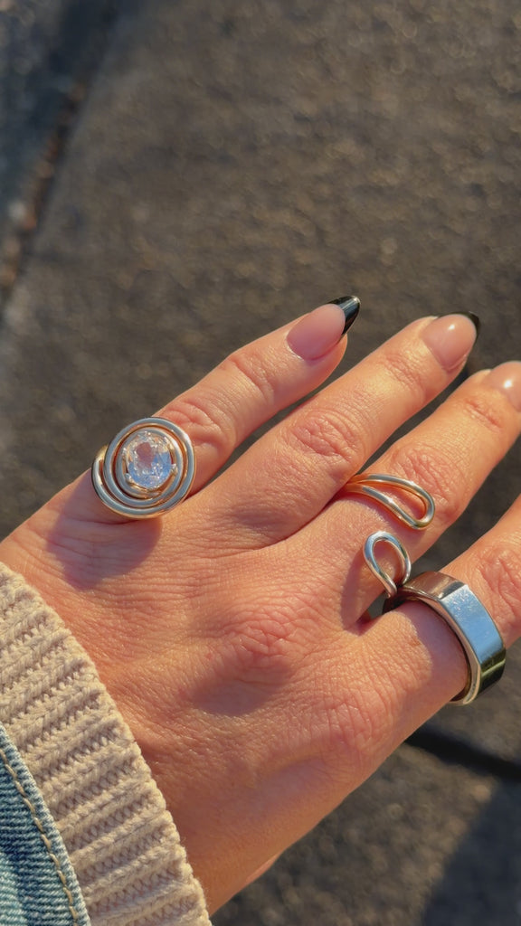A stunning twist on "old money" aesthetic with new "cool girl" luxury. This ring features an infinity design making it like nothing you have ever seen before. The stone is set with silver prongs.