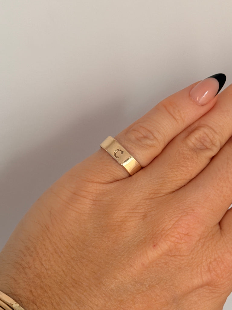 A different take on a stacking ring. This ring features a "square-ish" shape for a more bold look. It is actually so comfortable to wear! Featuring an initial stamp of your choice!